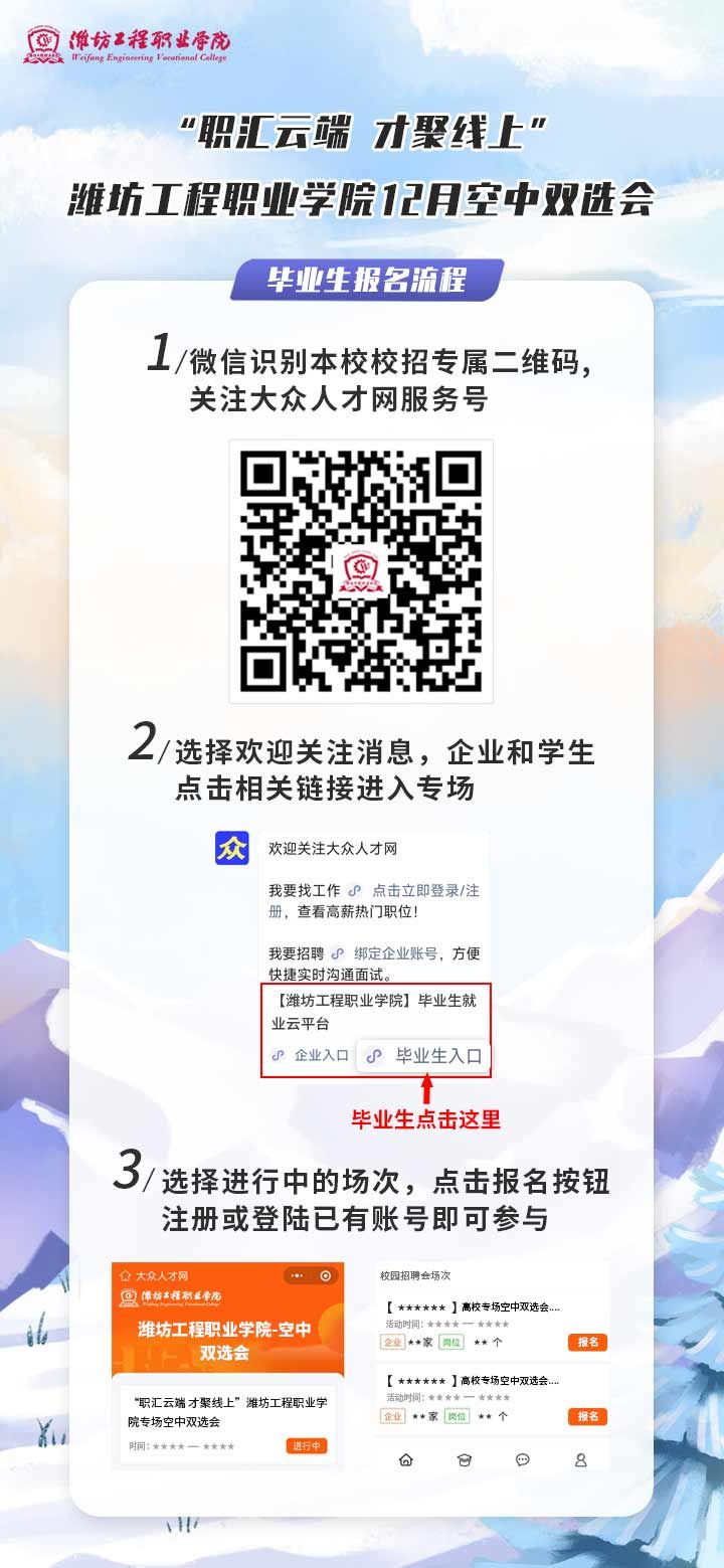 微信报名入口:手机微信扫码关注“大众人才网”微信公众号,企业和毕业生分别点击相关按钮进入潍坊工程职业学院校招端口,点击报名按钮,注册或登录已有账号即可直接参与。
