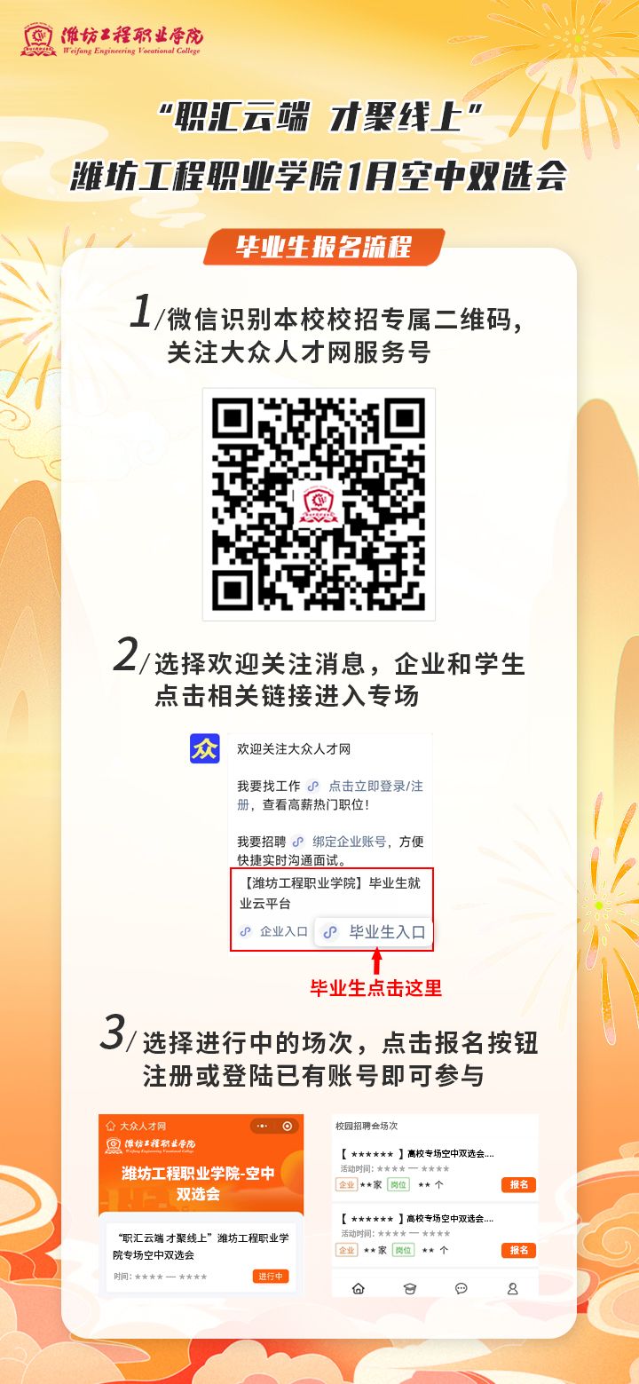 微信报名入口:手机微信扫码关注“大众人才网”微信公众号,企业和毕业生分别点击相关按钮进入潍坊工程职业学院校招端口,点击报名按钮,注册或登录已有账号即可直接参与。