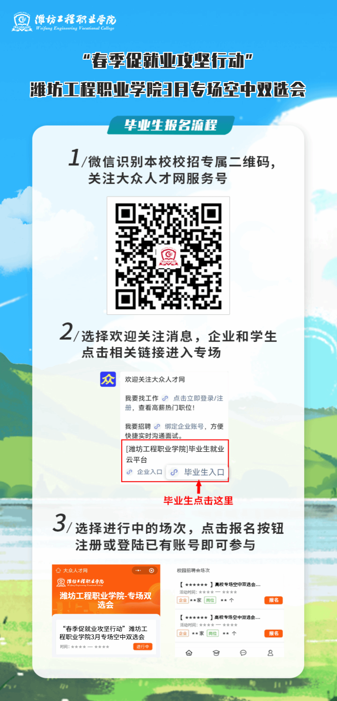 微信报名入口:手机微信扫码关注“大众人才网”微信公众号,企业和毕业生分别点击相关按钮进入潍坊工程职业学院校招端口,点击报名按钮,注册或登录已有账号即可直接参与。