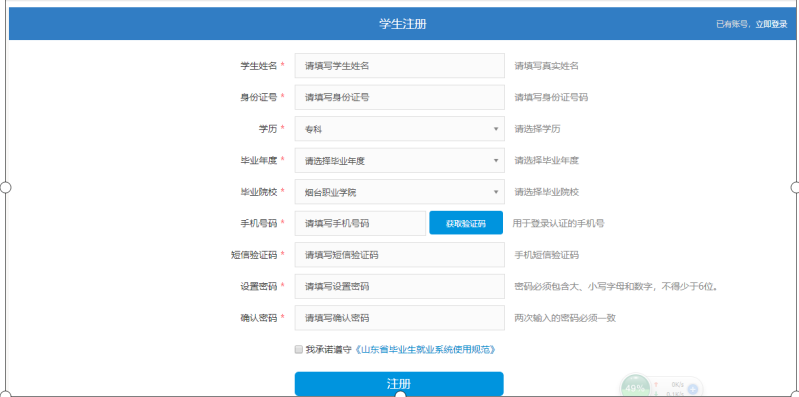 功能描述:学生通过山东高校毕业生就业信息网登录/注册入口,进入注册界面,完成信息填写,提交注册信息验证,验证通过注册成功。